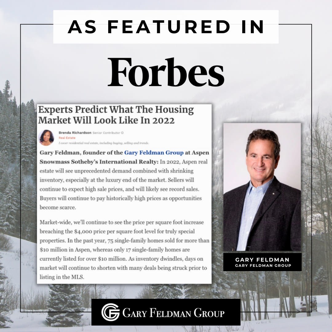 Gary Feldman, founder of the Gary Feldman Group at Aspen Snowmass Sotheby’s International Realty: In 2022, Aspen real estate will see unprecedented demand combined with shrinking inventory, especially at the luxury end of the market. Sellers will continue to expect high sale prices, and will likely see record sales. Buyers will continue to pay historically high prices as opportunities become scarce.