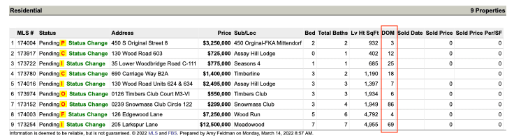 The below chart reflects Aspen and Snowmass Village properties that were pended over the weekend of March 11-13, 2022. Take a look at the days on market (DOM) column which indicates that buyers need to be ready to move quickly by learning the market, studying their preferred areas and being ready to jump on properties that fit their parameters. The bottom line is, sellers are still in control.