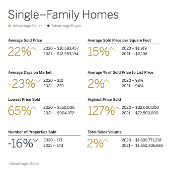 According to Aspen Snowmass Sotheby’s 2021 Market Report, Aspen Snowmass had another record-breaking year for real estate sales. Average single-family home sale prices were nearly $13 million compared to $10 million in 2020. Of those sales, the average price per square foot was $2,199 in 2021 compared to $1,919 in 2020 and the highest home price was $72 million in 2021 compared to $32 million in 2020.