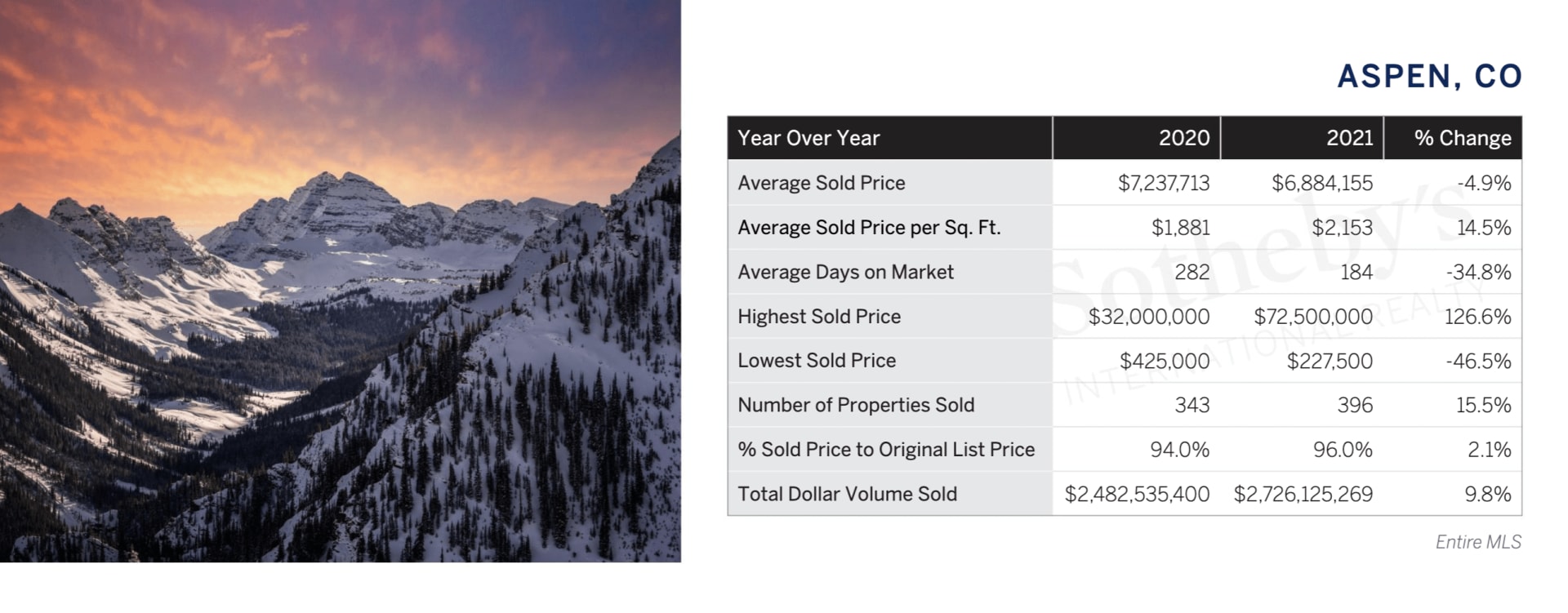 According to Sotheby's International Realty 2021 Resort Report, market speed increased at an expeditious rate. All regions saw a decrease in average days on market, ranging from 187 days at the highest to just seven days at the lowest. Additionally, all areas saw either an increase in the average sold price or total dollar volume sold. The results of 2021 indicate clearly that buyer demand is continuing to go up, and with limited inventory, sellers will continue to be in an optimal position. Aspen alone reached nearly $3 billion in sales last year.